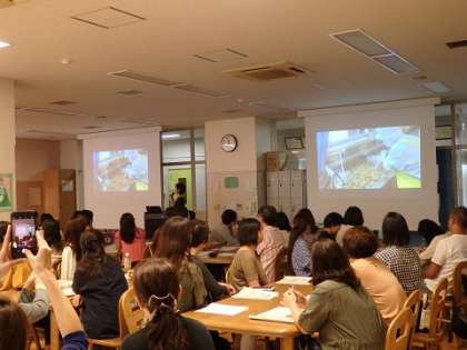 給食試食会が今日28日に行われました。メニューは、さつま芋ごはん・魚のステーキソース・じゃこサラダ・沢煮椀・キャロットゼリー・牛乳です。素材の味を引き出す調理方法、徹底した衛生管理に驚きの声があがりました。配膳や片付けも中学校以来のことで、「結構大変ですね」と言いながらたくさんの笑顔があり、和やかな雰囲気の試食会でした。