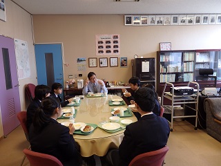 今日、6日の給食のメニューは、「黒砂糖パン、フレンチエッグ、大根とカシューナッツのサラダ、野菜スープ、牛乳」です。普段はクラスメイトとおしゃべりしながらの給食ですが、今日は、校長先生と生徒会役員の昼食会。緊張気味の生徒会役員。校長室で食べると、なんとなく味の感じ方も違ったかな。難しい話は抜きにして、おいしくいただきました。