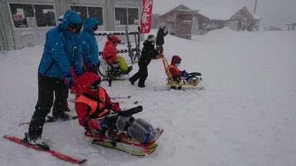 雪が降りしきる中、2日目がスタートしました。チェアスキーに挑戦中。がんばります。