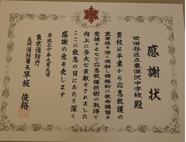 本校では、毎年3年生が救命講習を受講しています。応急救護の重要性を理解し、いざという時に「力」になれる人になってほしいという願いが、この講習には込められています。この度、積極的に救命講習を行った功績がたたえられ、、玉川消防署より感謝状が授与されました。この感謝状に恥じないよう、これからも救命講習を続けていきたいです。