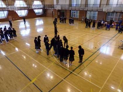 今日、27日(火)に、パラリンピック競技応援校の取組の一環として、1年生を対象としたボッチャ講習会を行いました。日本ボッチャ協会から強化指導部長の村上光輝様、ロンドンオリンピック新体操日本代表の田中琴乃様を講師としてお招きしました。ボッチャは障害の有無に関係なく、誰でも楽しめるスポーツです。簡単そうに見えますが、狙ったところに投げるのは中々難しく、苦戦をしながらも笑顔いっぱいの1時間でした。