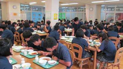 今年度初めての食堂給食が実施されました。 3年生全員で和気あいあいと給食を食べました。