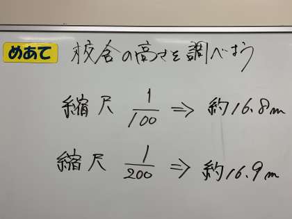 佐藤先生は15cmの定規しかなかったので、縮尺を200分の1にして計算したところ、校舎の高さは約16.9mになりました。