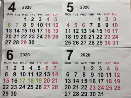 ずっと家にいると「あれ今日何日だっけ?」とつい忘れてしまうこと、ありませんか?そんな時に役立つのがカレンダーですね。I組にももちろんあります。いちばん左の写真は、みんなが1月から2月にかけて一生懸命作った手作りカレンダーです。覚えてますか?ちなみに、他の写真は職員室のカレンダーです。