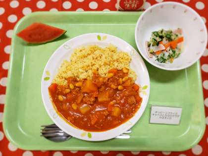 カレーピラフにピリ辛のチリビーンズソースをかけた「チリビーンズライス」は、ひそかな人気メニューです。豆が苦手でもおいしく食べられると先生方にも好評でした。チリビーンズは南米料理で、インゲン豆を使うことが多いのですが、今日は大豆を使いました。乾燥大豆を給食室で煮ていますよ。