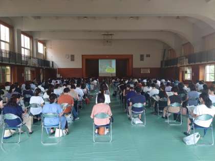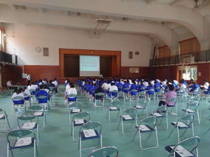 第1回進路説明会が、体育館で行われました。9時45分〜10時までが、生徒対象の説明書で、10時45分〜11時45分までが、保護者対象の説明会でした。どちらも、校長からの挨拶の後、進路指導主任の蔵田主幹教諭から、進路についての説明がありました。3年生の生徒のみなさんは、真剣に説明を聞いていました。保護者の方は、お忙しい中180名以上の参加がありました。ありがとうございました。