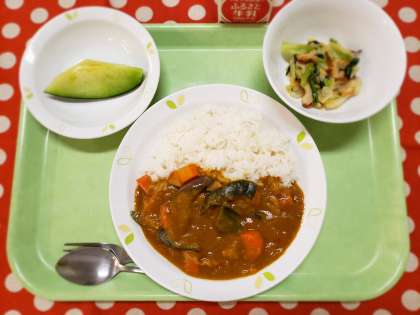 「夏野菜カレーライス」には、夏野菜(かぼちゃ、なす、トマト、ピーマン)をたっぷり使いました。野菜そのものの味を味わえるように、かぼちゃ、なす、ピーマンは、素揚げしてからルーに加えています。夏の暑い時期に合うように、少し辛めになっていましたが、じっくり炒めたたまねぎの甘みもしっかりとあり、「おいしかったー!」の声をたくさん聞くことができました。