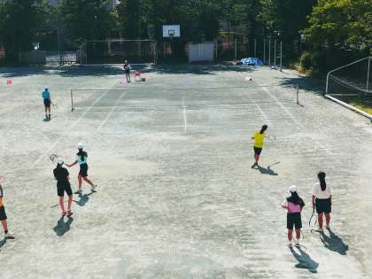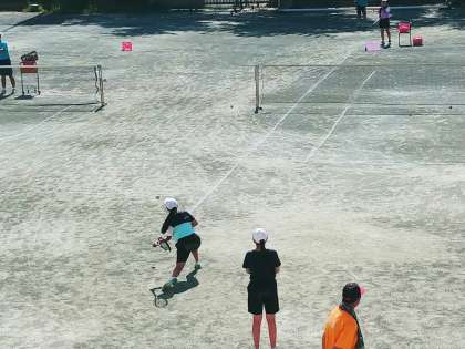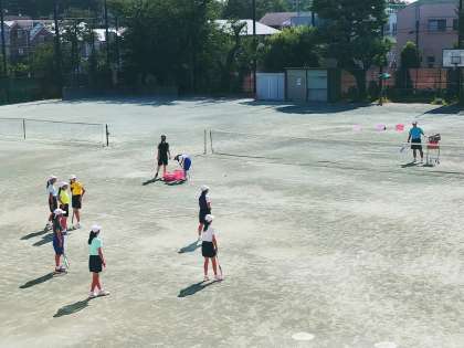 ソフトテニス部の練習では、しっかりと的を狙って打ち返しています。