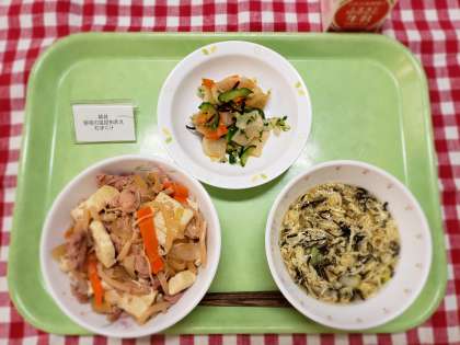 今日の「豚丼」は、昨年度3学期の旧1年D組のリクエストで、3月に提供予定だったメニューです。旧1年D組のみなさん、覚えていますか?