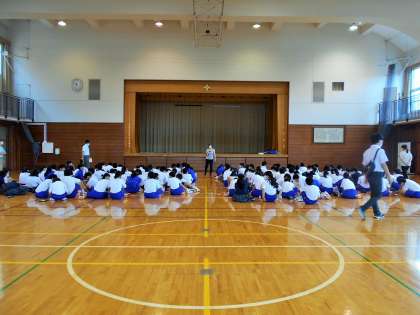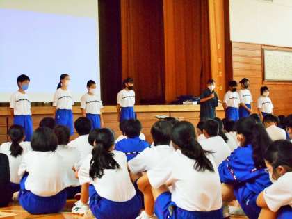 学年集会では学級委員が普段の生活の反省や、これからの改善点についてみんなの前で話をしました。