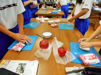 野菜か果物の実物を実際に持ってきて、本物そっくりに粘土でつくります。