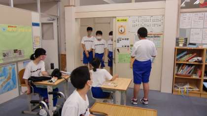 生活委員は、毎朝の週番活動(玄関前でのあいさつ運動)を行っています。それが終ると、3年生はI組の教室へ寄って、元気の出る一言をかけています。「熱中症に気を付けましょう」や「今日の給食は○○です」など。I組の生徒は笑顔で応じてくれます。最後に「みしまの森6箇条」を唱えてみんなでポーズ!素敵な交流が生まれています。