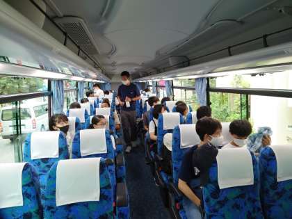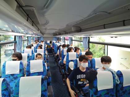 バスに乗りました。担任の先生が、座席をまわって、生徒一人一人を消毒です。