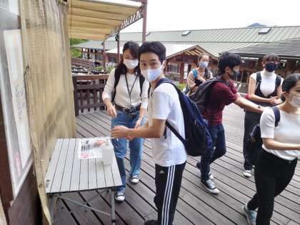 バーベキューハウスに、入る前に手をしっかり消毒します!