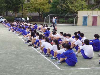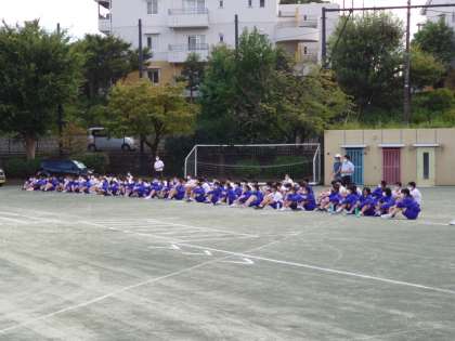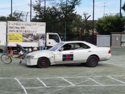 世田谷区交通安全課、玉川警察、スタントマンによる交通安全教室が校庭で実施されました。スタントマンの迫力ある実演を、みなさん真剣に見ていました。