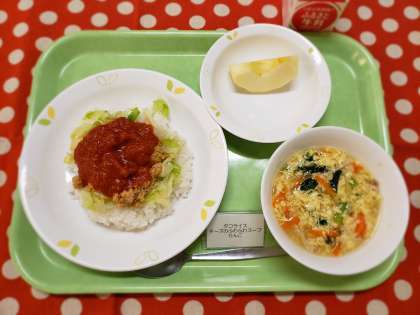 数年前、ある先生からのリクエストにより、試行錯誤を重ねて、制約の多い給食用に考えたメニューです。トッピングが多いので配膳に手間がかかりますが、いろいろな味が口の中で混ざり合っておいしく、人気のメニューとなりました。