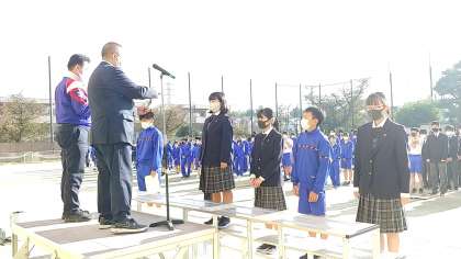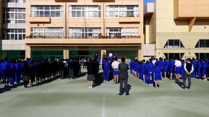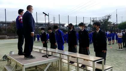 温かい日差しの中、生徒たちの集合も予定時刻前に完了し、余裕をもって朝礼を行うことができました。