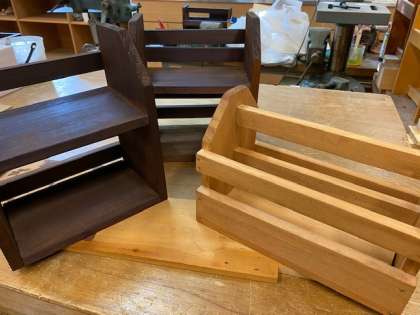 写真の作品は、CDラックに道具入れです。これを1枚の板の状態から設計し組み立てました。釘打ちなどでは苦戦しましたが、一人一人個性のある素晴らしい作品に仕上げることができました。