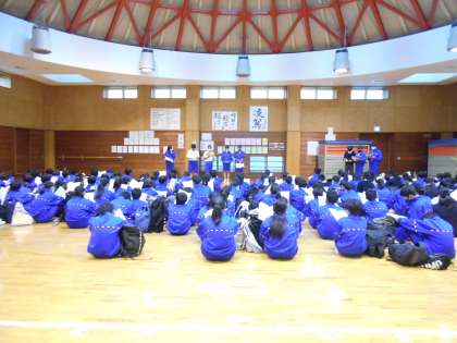 1年生は明日の校外学習に向けて、学年で集まっていました。