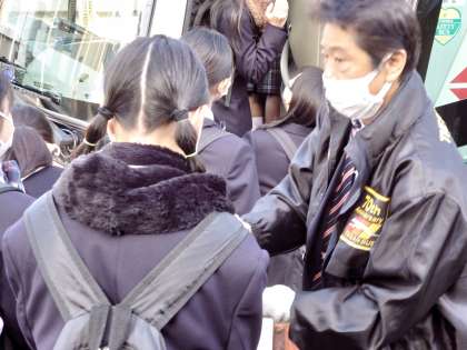 バスに乗る前に、運転手さんによる手の消毒を行います。