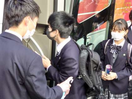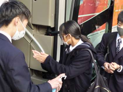 バスに乗る前に、運転手さんによる手の消毒を行います。