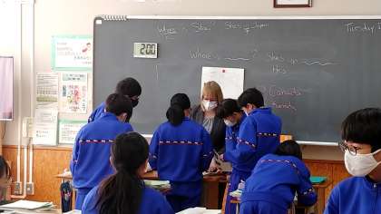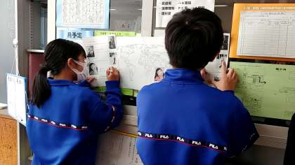 1年生の英語は、有名な人がどこにいるかを探し、場所の聞き方や答え方を身に付ける授業でした。