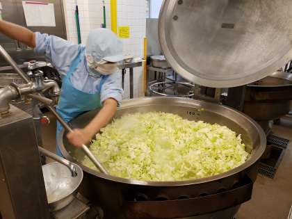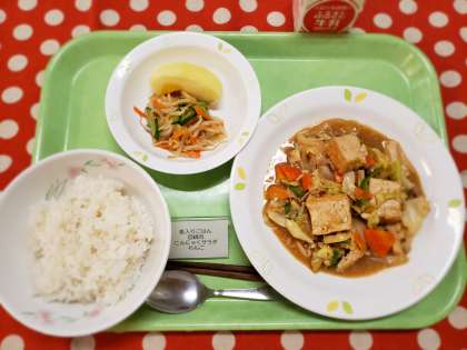 給食でも、生揚げやキャベツをそれぞれ加熱し、最後に調味料と合わせて作りました。