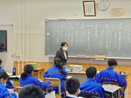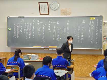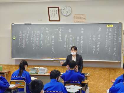 国語科の高橋教諭が初任者研修の研究授業を1年B組を対象に教室で行いました。単元名は、「とらわれた心に突き立つ矢━宇治拾遺物語」です。その様子です。