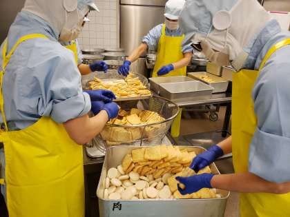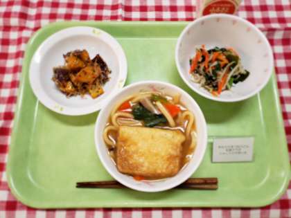 給食では、おもちを油揚げに包んで甘辛く煮付けた「もち入りきつね」をうどんにのせました。給食室でひとつひとつ包んでいます。