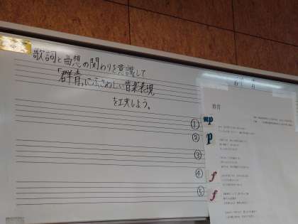 本日のめあては「歌詞と曲想の関わりを意識して、楽曲にふさわしい音楽表現を工夫しよう」です。曲名は「群青」です。