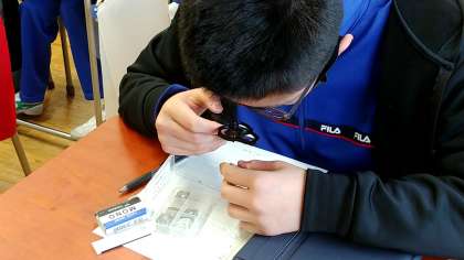 実物の堆積岩を観察し、気になってことなどタブレットPCで調べていました。