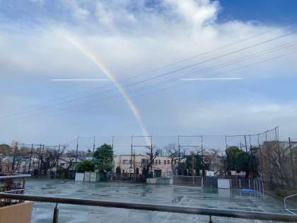 窓際に生徒が集まっていたので空を見てみると、綺麗な虹が見えました♪