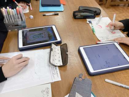 缶バッジのデザインを考えるために、タブレットを活用している生徒もいました!