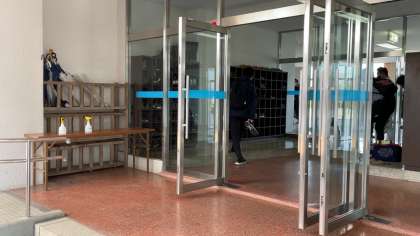 入り口では消毒して学園内に入ります。