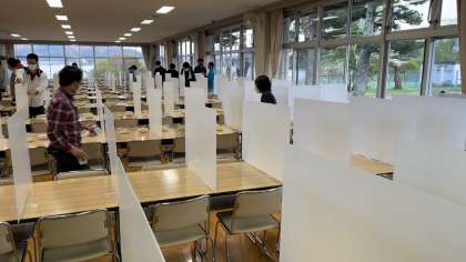 食事はパーテーションで仕切り同じ方向を向いて食べます。