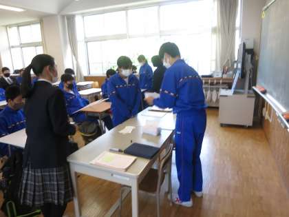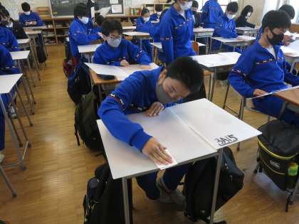 今日の1時間目はパーテーションの消毒、新聞記事の紹介、体育祭に向けての話し合いを行いました。