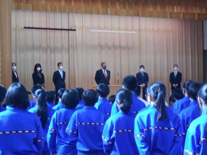 1年生はオンライン、2,3年生は体育館で離任された5人の先生のお話を聞きました。