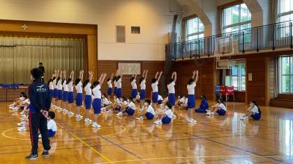 ラジオ体操はペアワークでお互いに体操を見て、良いところ、課題などを伝えていました。