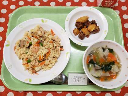 かつおにはビタミンやミネラルのほか、鉄分がたっぷり含まれているので、成長期にはぜひ食べて欲しい食材です。しかし加熱すると固くなりパサついて食べにくくなってしまうので、今日のような調理法でおいしく食べてもらえたら、と思います。1年生もたくさんおかわりしていましたね!