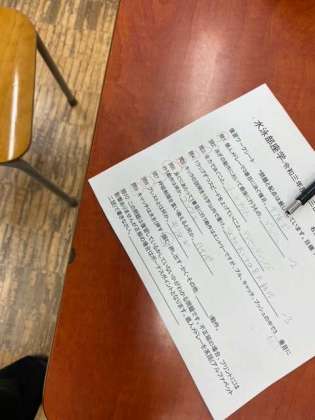 水泳部です。今日は週に一度の座学の日です。水泳に関する基礎知識をテストしています。