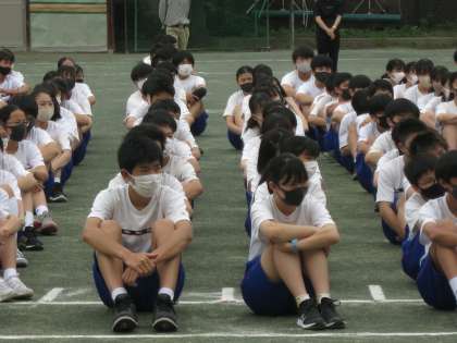 「ラジオ体操が終わった後、髪を触ったりせず、気をつけで待ちましょう」