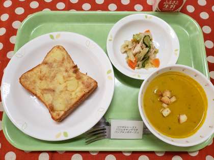 「パンプキンポタージュ」のかぼちゃは、皮にも風味と栄養があるため、皮をむかずに丸ごとポタージュにしています。そのため、色が少し緑がかってしまいます。