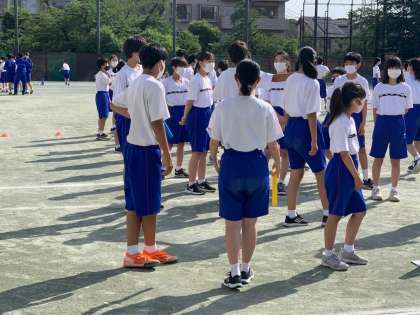今朝、体育委員が校庭のライン引きをしてくれました。そのあと、1年生の朝練に参加し、教えている場面がありました。