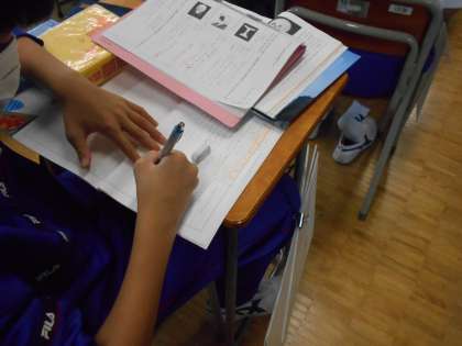 最後に自分の意見をまとめる際、ペンが止まってしまう生徒へ先生から一言。