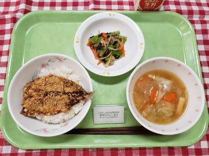 今日は、旬のいわしをから揚げにしてごはんに乗せ、しょうがの効いた甘辛いタレをかけた「いわしのかば焼き丼」でした。
