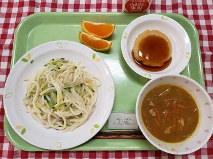 今日は、茹でてから冷やしたうどんを温かいカレーだしにつけて食べる「カレーつけめん」と、北海道の郷土料理の「いももち」です。