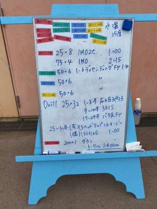 水泳部です。水温は25度、小雨降る中、本日の練習メニューを頑張っています!トータル2,400m(松田)