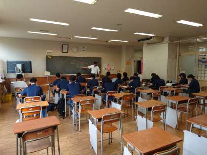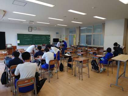 本日7/26(月)午前10時〜10時50分に行われました、夏季休業中補習教室の様子です。1年生は社会科上村先生、2年生は英語科松田先生、3年生は理科栗山先生が教えています。