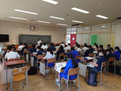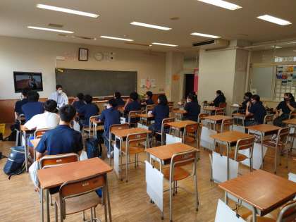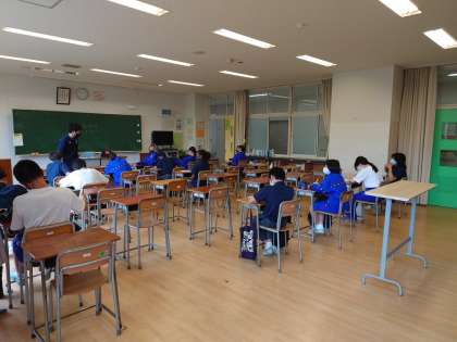 本日7/28(水)午前10時〜10時50分に行われました、夏季休業中補習教室の様子です。1年生は社会科上村先生、2年生は理科栗山先生、3年生は理科曽根先生が教えています。