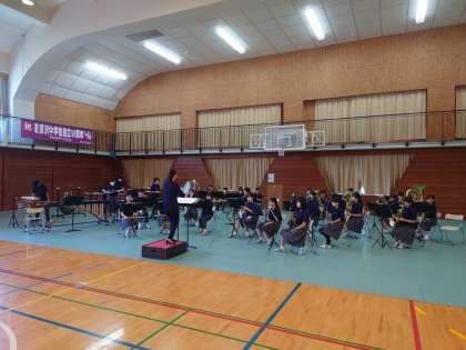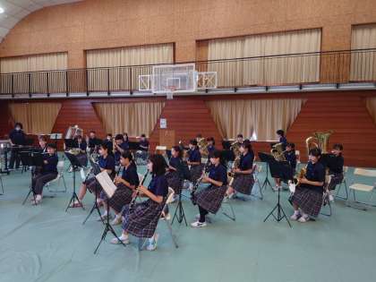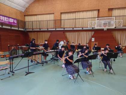 吹奏楽部の部活動の様子です。暑い中、体育館で全体練習を行っていました。すごいですね。